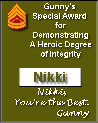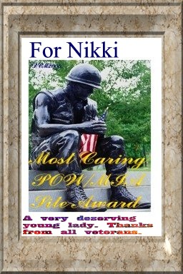 This very special award is from my very special friend, "Doc". Doc, although I am very honored to receive this, I would like to SALUTE YOU for your service and your willingness to share your memories. Stop by Doc's pages, tell him that Nikki sent you and I thank him every day. Thanks Doc! |