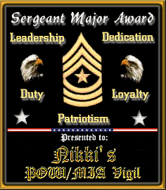 To all whom this site shall come "Greetings" Know ye, that I, confiding in the outstanding "PATRIOTISM-LOYALTY-INTEGRITY" of Nikki's POW/MIA Vigil Website do as of this date, 9 February, in the year of our Lord, Two Thousand-The New Millenium and of the great Independence of the "United States of America" the two hundred and twenty fourth year bestowed upon the above names "Patriot" with great pride for the exceptional display of "Outstanding Patriotism" This award presented by Al Varelas-USMC Decorated Vietnam Veteran 26th Marine Regiment Khe Sanh Combat Base Republic of South Vietnam Know ye all who preview this presentation, that this Award is confered upon True Patriots only. Be it also know that this Award is given at the discretion of it's originator, or by recommendation of a receipient, and cannot be applied for..... WOW! What an honor!!! Thank you so much Mr. Varelas!!! Please visit his web site and tell him that Nikki thanks him very much!!! |
