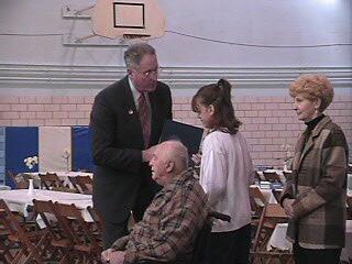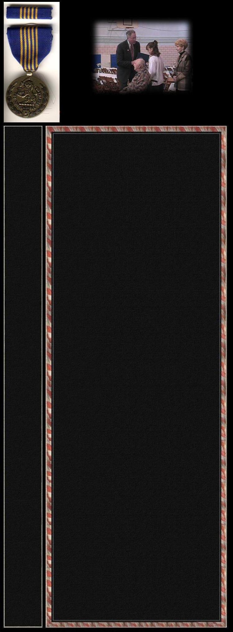 On February 28, 2001 my mom told me there was going to be a special assembly at my school because VFW Post 5758 was going to present the school with new flags. When I arrived at the assembly I was surprised to see that not only was the VFW Post there, but Brigadier General John Patten and Mr. Kridlo were there as well! Then Brigadier General Patten called me up and I REALLY got a surprise! By order of Governor Ridge, I was being awarded the PA Medal of Commendation, the second highest honor that can be bestowed on an individual in the state of PA! BG Patten had come all the way from Ft. Indiantown Gap to present it to me! |