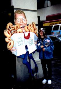 | We went up the street street to the Bagel Cafe and I got my picture taken with "their" Dave holding the bagels of the day!! |