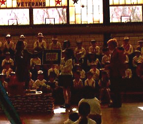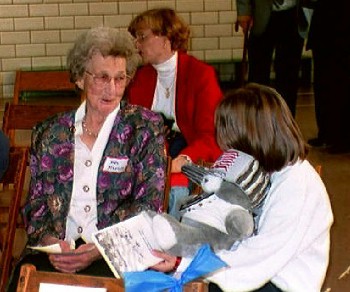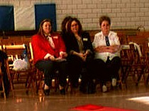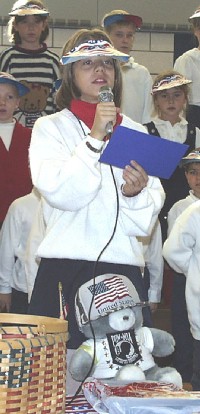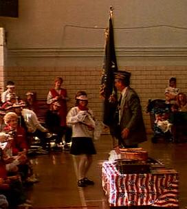 | I got called to the microphone one more time, but this time I didn't know by who!!!! When my principal called me up the next thing I heard was that "Louise Hoover" would like to present something to Nikki! I was so surprised (mom didn't even tell me she was coming) and I was so excited. This was "our Weezie"!!!!!!!!! We had never met before, only through the Internet. She presented me, on behalf of her American Legion Post and Operation Just Cause, a POW/MIA shirt, a desk flag, a magnet and I was so proud!!! I couldn't believe that I got to meet her!!! Thank you so much Weezie, I am so glad I met you and I am very proud of you!!! |