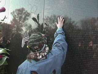 | Then we went to The Wall. I left something for all of my adopted POW/MIA's and told them that they will never be forgotten. This is me touching the name of Sgt. Arlie Mangus. I usually wear a small American Flag on my hat, wait until you see what I did with it. |