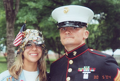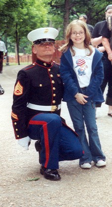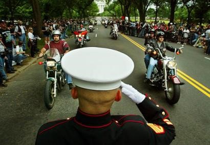 A U.S. Marine salutes motorcycle riders in the Rolling Thunder's 17th Annual Motorcycle Ride and Rally, Sunday, May 30, 2004 in Washington. More than 250,000 motorcycles are expected for the rally by Rolling Thunder, an organization dedicated to creating awareness of POW/MIA issues from all wars. (AP Photo/Pablo Martinez Monsivais) |